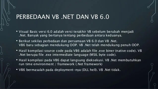 Sehingga setiap executeable hasil kompilasi dari vb.net perlu dijadikan sebagai self installer melalui package manager bawaan dari visual . Vb.net memiliki dua operator logis — andalso dan orelse — dan mereka menambahkan. Net framework agar hasil compile ini bisa berjalan. Misalkan anda mengkodekan tes hasil perhitungan seperti ini:. Pemrograman berorientasi objek (oop)sunting .